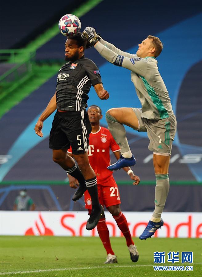 8月19日,拜仁慕尼黑队门将诺伊尔(右)在比赛中扑救。 当日,在葡萄牙里斯本举行的2019-2020赛季欧洲足球冠军联赛半决赛中,德甲拜仁慕尼黑队以3比0战胜法甲里昂队,挺进决赛。 新华社发(欧足联供图)