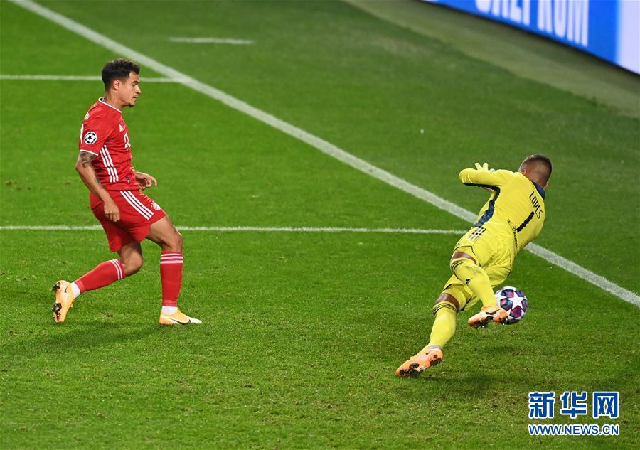 8月19日,拜仁慕尼黑队库蒂尼奥(左)进球随后被判无效。 当日,在葡萄牙里斯本举行的2019-2020赛季欧洲足球冠军联赛半决赛中,德甲拜仁慕尼黑队以3比0战胜法甲里昂队,挺进决赛。 新华社发(欧足联供图)