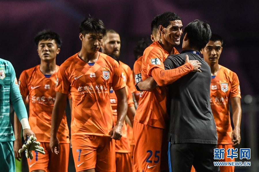 8月19日,山东鲁能泰山队球员费莱尼(右三)赛后与主教练李霄鹏(右二)拥抱庆祝。 当日,在2020中国平安中国足球协会超级联赛(大连赛区)第六轮比赛中,山东鲁能泰山队以2比1战胜河南建业队。 新华社记者潘昱龙摄
