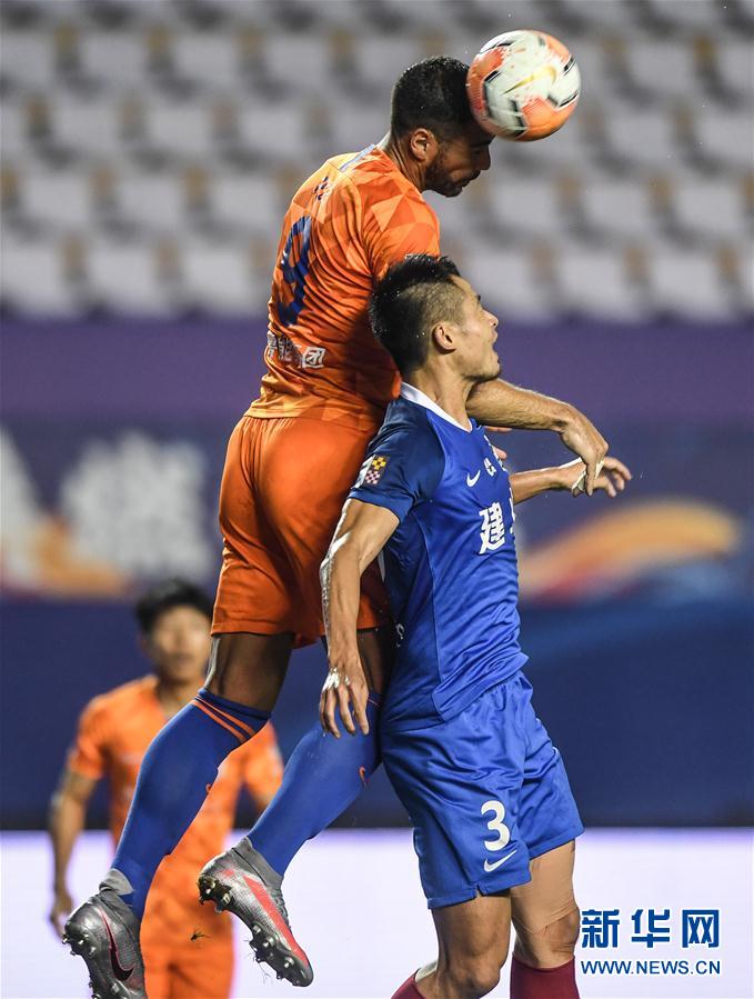 8月19日,山东鲁能泰山队球员佩莱(左)在比赛中与河南建业队球员张文涛争抢头球。 当日,在2020中国平安中国足球协会超级联赛(大连赛区)第六轮比赛中,山东鲁能泰山队以2比1战胜河南建业队。 新华社记者潘昱龙摄