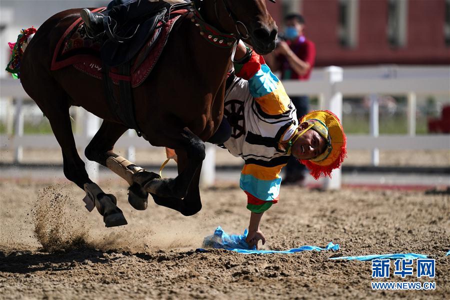 8月20日,一名骑手表演马上拾哈达。 当日,拉萨雪顿节民族传统马术表演在拉萨市北郊赛马场进行。 新华社记者 詹彦 摄