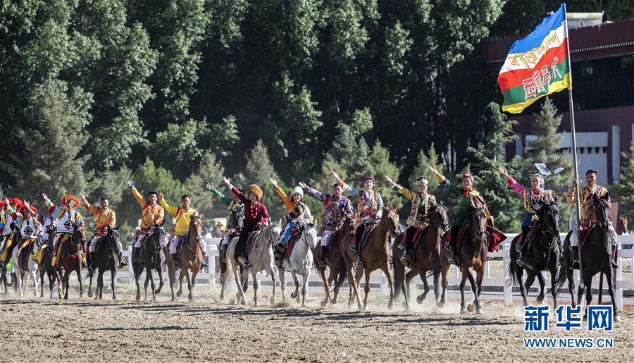 8月20日,骑手们集体亮相。 当日,拉萨雪顿节民族传统马术表演在拉萨市北郊赛马场进行。 新华社记者 孙非 摄