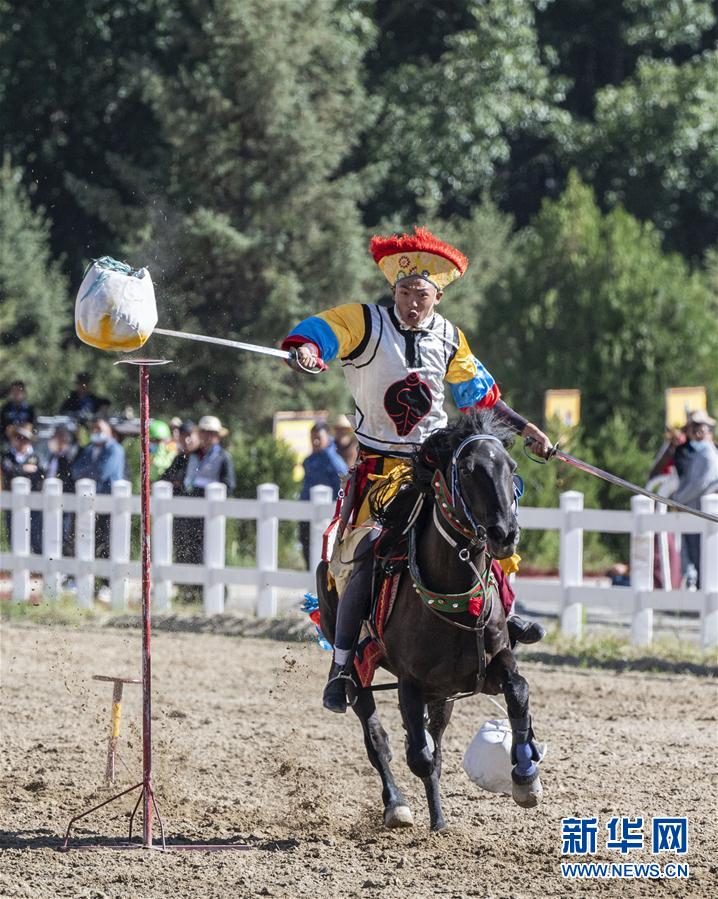 8月20日,骑手表演马上砍杀。 当日,拉萨雪顿节民族传统马术表演在拉萨市北郊赛马场进行。 新华社记者 孙非 摄