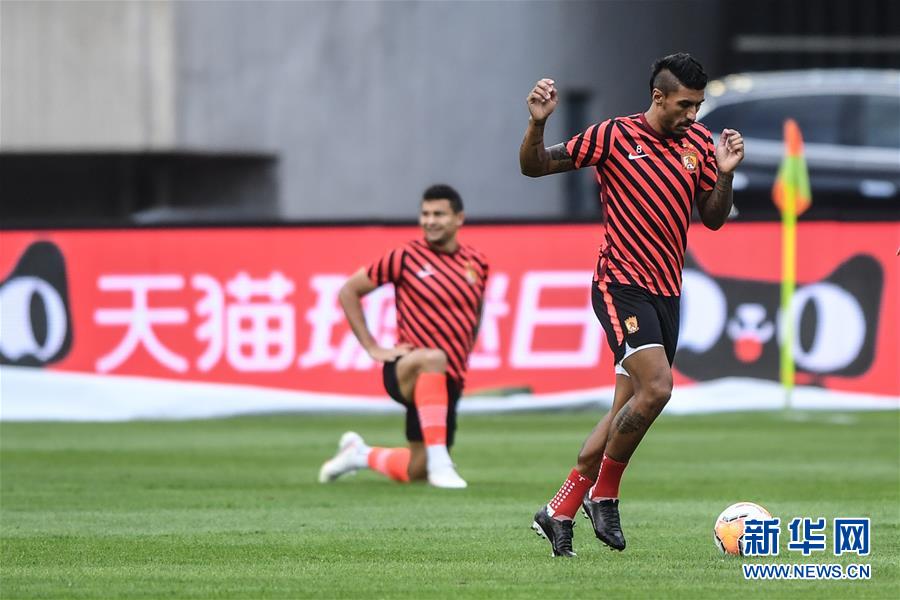 8月20日,广州恒大淘宝队球员保利尼奥(右)在赛前训练中。 当日,在2020赛季中国足球协会超级联赛第一阶段(大连赛区)第六轮比赛中,广州恒大淘宝队对阵江苏苏宁易购队。 新华社记者潘昱龙摄