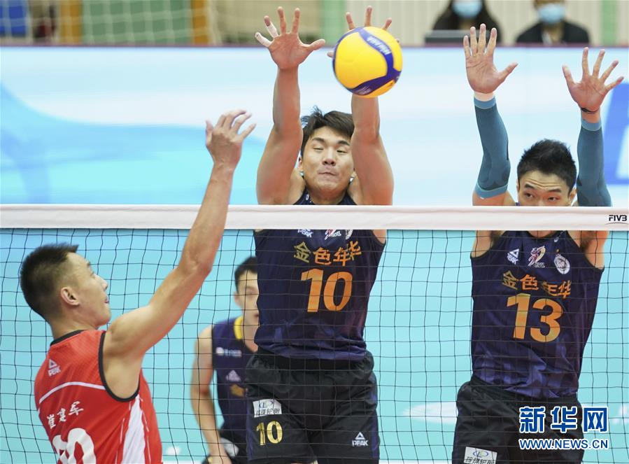 8月20日,上海金色年华队选手武弸智(右二)在比赛中拦网。 当日,在河北省秦皇岛市国家体育总局秦皇岛训练基地进行的2019-2020赛季中国男子排球超级联赛第一阶段A组比赛中,上海金色年华队以3比1战胜河南队。 新华社记者 杨世尧 摄