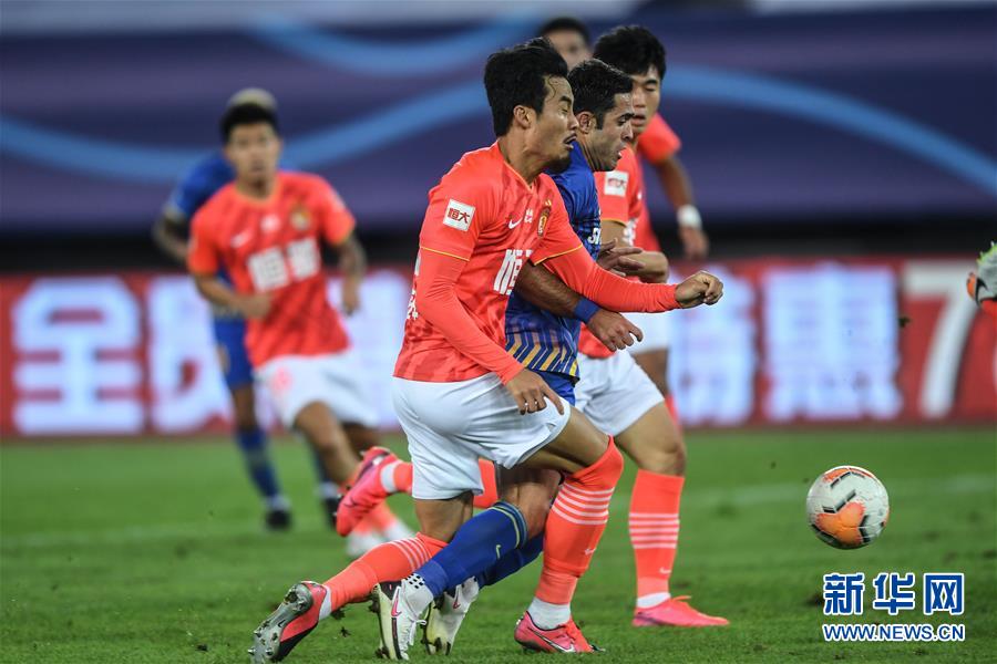 8月20日,江苏苏宁易购队球员埃德尔(前右)在比赛中射门并取得进球。 当日,在2020赛季中国足球协会超级联赛第一阶段(大连赛区)第六轮比赛中,广州恒大淘宝队以2比1战胜江苏苏宁易购队。 新华社记者潘昱龙摄
