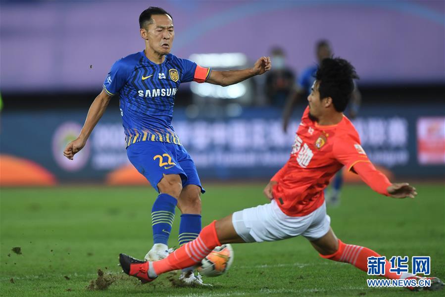 8月20日,江苏苏宁易购队球员吴曦(左)在比赛中射门。 当日,在2020赛季中国足球协会超级联赛第一阶段(大连赛区)第六轮比赛中,广州恒大淘宝队以2比1战胜江苏苏宁易购队。 新华社记者潘昱龙摄
