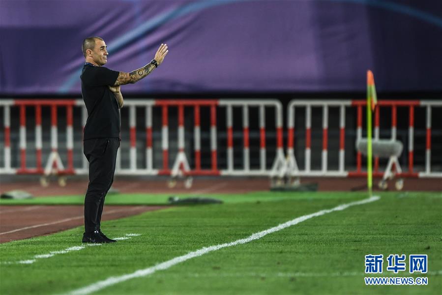 8月20日,广州恒大淘宝队主教练卡纳瓦罗在场边指挥。 当日,在2020赛季中国足球协会超级联赛第一阶段(大连赛区)第六轮比赛中,广州恒大淘宝队以2比1战胜江苏苏宁易购队。 新华社记者潘昱龙摄