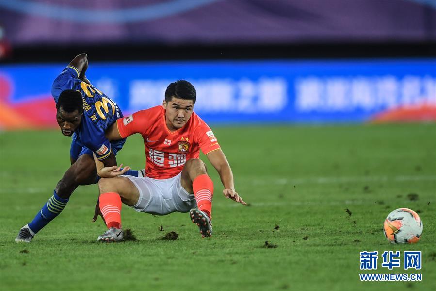 8月20日,江苏苏宁易购队球员瓦卡索(左)与广州恒大淘宝队球员钟义浩在比赛中拼抢。 当日,在2020赛季中国足球协会超级联赛第一阶段(大连赛区)第六轮比赛中,广州恒大淘宝队以2比1战胜江苏苏宁易购队。 新华社记者潘昱龙摄