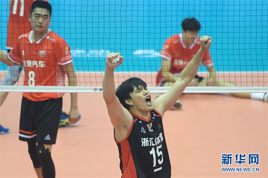 8月20日,浙江体彩队球员金志鸿(中)在比赛中庆祝得分。 当日,在河北省秦皇岛市国家体育总局秦皇岛训练基地进行的2019-2020赛季中国男子排球超级联赛第一阶段B组比赛中,浙江体彩队以3比1战胜北京汽车队。 新华社记者朱旭东摄