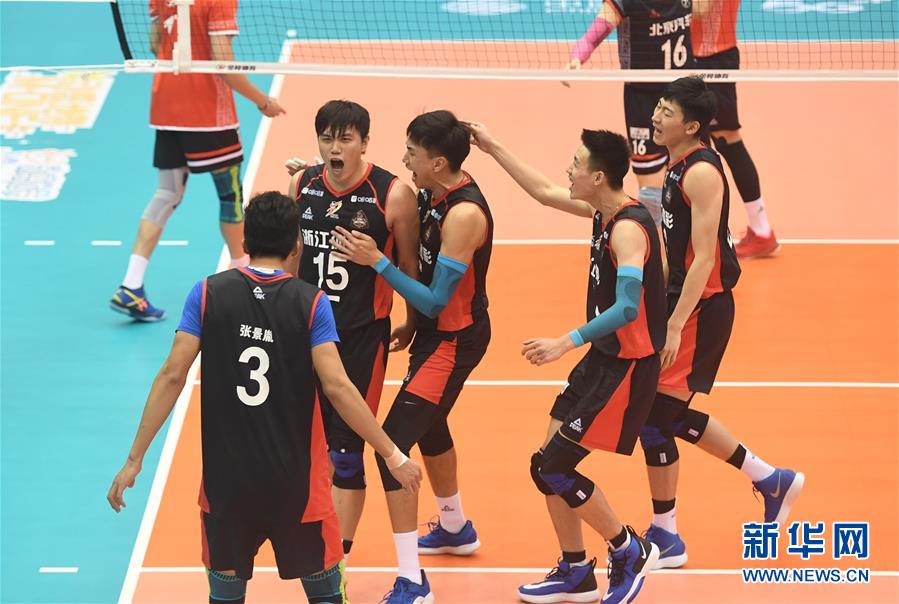 8月20日,浙江体彩队球员在比赛中庆祝得分。 当日,在河北省秦皇岛市国家体育总局秦皇岛训练基地进行的2019-2020赛季中国男子排球超级联赛第一阶段B组比赛中,浙江体彩队以3比1战胜北京汽车队。 新华社记者朱旭东摄