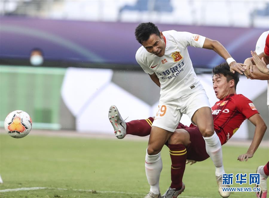 8月21日,武汉卓尔队球员张成林(左)与河北华夏幸福队球员任航在比赛中拼抢。 当日,在2020赛季中国足球协会超级联赛第一阶段(苏州赛区)第六轮比赛中,武汉卓尔队以1比3负于河北华夏幸福队。 新华社记者杨磊摄