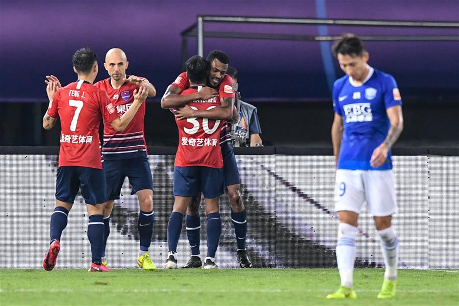 8月21日,重庆当代队球员西里诺(左四)进球后与队友庆祝。 当日,在2020赛季中国足球协会超级联赛第一阶段(苏州赛区)第六轮比赛中,重庆当代队以1比0战胜石家庄永昌队。 新华社记者李博摄