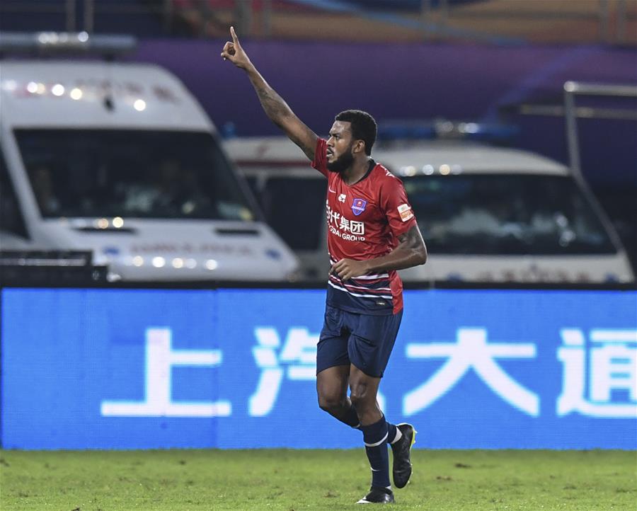 8月21日,重庆当代队球员西里诺庆祝进球。 当日,在2020赛季中国足球协会超级联赛第一阶段(苏州赛区)第六轮比赛中,重庆当代队以1比0战胜石家庄永昌队。 新华社记者李博摄