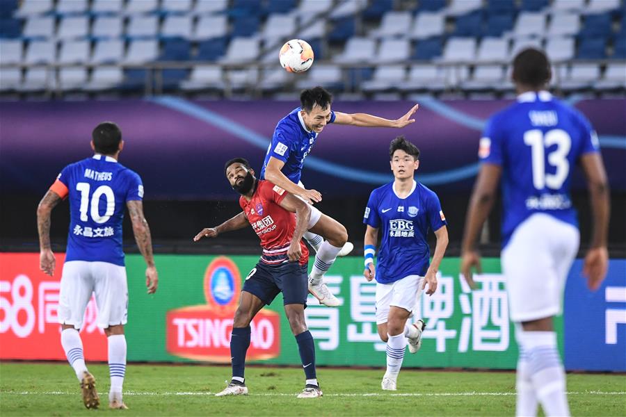 8月21日,重庆当代队球员费尔南迪尼奥(左二)和石家庄永昌队球员王鹏(左三)在比赛中争抢。 当日,在2020赛季中国足球协会超级联赛第一阶段(苏州赛区)第六轮比赛中,重庆当代队以1比0战胜石家庄永昌队。 新华社记者李博摄