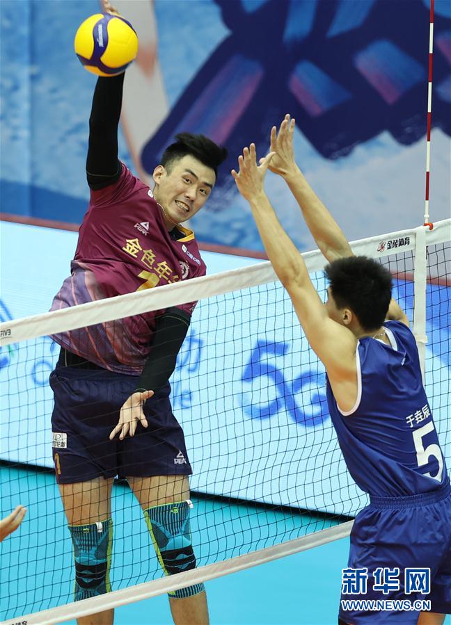 8月24日,上海金色年华队球员戴卿尧(左)在比赛中扣球。 当日,在河北省秦皇岛进行的2019-2020赛季中国男子排球超级联赛第二阶段E组比赛中,上海金色年华队以3比1战胜江苏南京广电猫猫队。 新华社记者 杨世尧 摄
