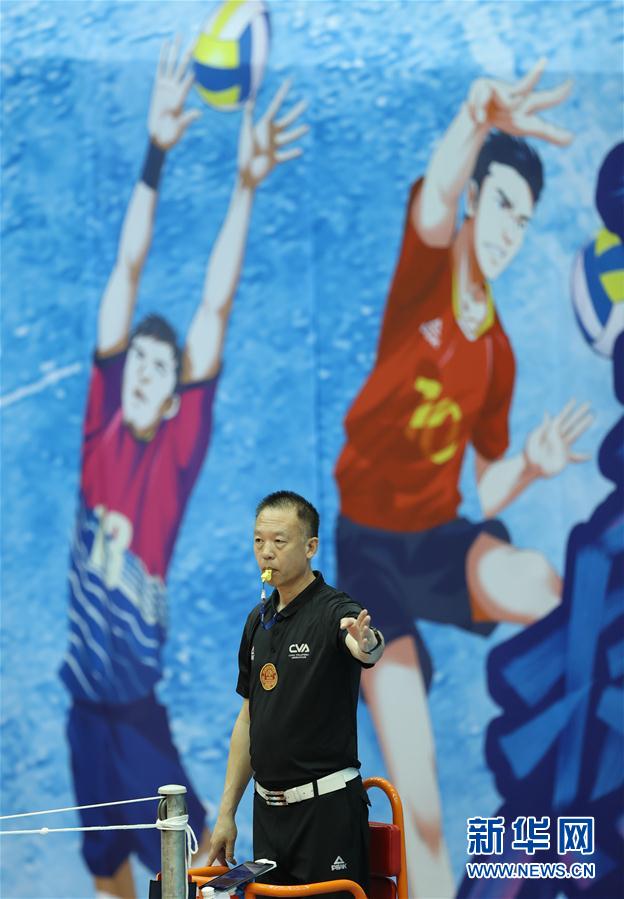 8月24日,裁判付浩在比赛中。 当日,在河北省秦皇岛进行的2019-2020赛季中国男子排球超级联赛第二阶段E组比赛中,江苏南京广电猫猫队以1比3不敌上海金色年华队。 新华社记者 杨世尧 摄