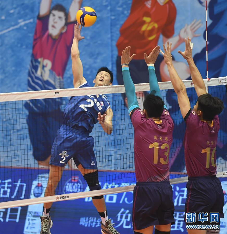 8月24日,江苏南京广电猫猫队球员俞元泰(左)在比赛中扣球。 当日,在河北省秦皇岛进行的2019-2020赛季中国男子排球超级联赛第二阶段E组比赛中,江苏南京广电猫猫队以1比3不敌上海金色年华队。 新华社记者 朱旭东 摄