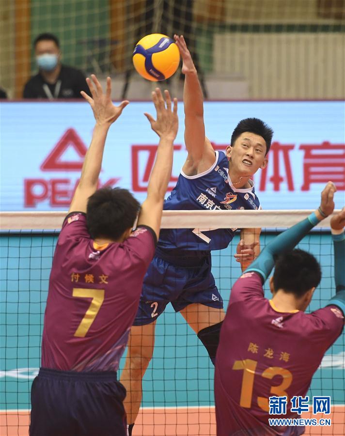8月24日,江苏南京广电猫猫队球员俞元泰(中)在比赛中进攻。 当日,在河北省秦皇岛进行的2019-2020赛季中国男子排球超级联赛第二阶段E组比赛中,江苏南京广电猫猫队以1比3不敌上海金色年华队。 新华社记者 朱旭东 摄
