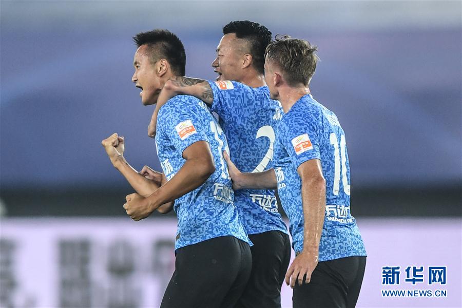 8月25日,大连人队球员王耀鹏(左)进球后与队友庆祝。 当日,在2020赛季中国足球协会超级联赛第一阶段(大连赛区)第七轮比赛中,广州恒大淘宝队以2比2战平大连人队。 新华社记者潘昱龙摄