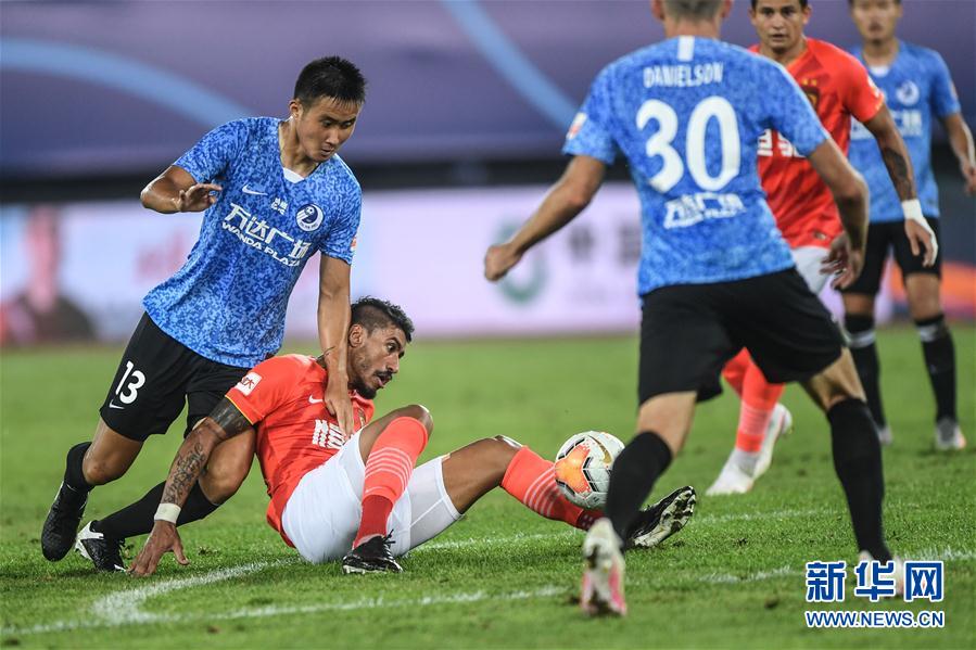 8月25日,广州恒大淘宝队球员保利尼奥(左二)在比赛中拼抢。 当日,在2020赛季中国足球协会超级联赛第一阶段(大连赛区)第七轮比赛中,广州恒大淘宝队以2比2战平大连人队。 新华社记者潘昱龙摄