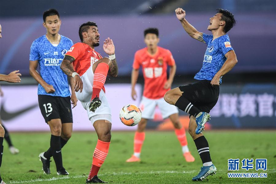 8月25日,广州恒大淘宝队球员保利尼奥(左二)与大连人队球员童磊(右)拼抢。 当日,在2020赛季中国足球协会超级联赛第一阶段(大连赛区)第七轮比赛中,广州恒大淘宝队以2比2战平大连人队。 新华社记者潘昱龙摄