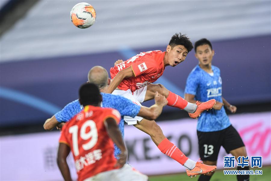8月25日,广州恒大淘宝队球员谭凯元(右二)在比赛中争抢头球。 当日,在2020赛季中国足球协会超级联赛第一阶段(大连赛区)第七轮比赛中,广州恒大淘宝队以2比2战平大连人队。 新华社记者潘昱龙摄