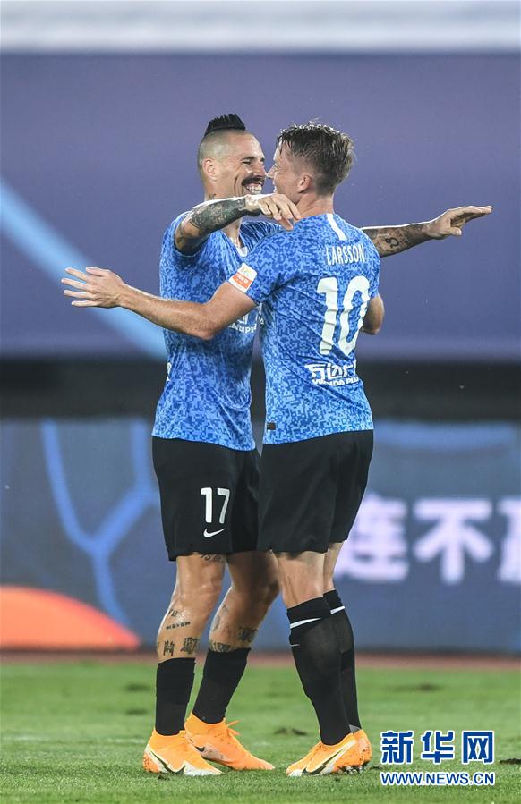 8月25日,大连人队球员拉尔森(右)进球后与队友哈姆西克庆祝。 当日,在2020赛季中国足球协会超级联赛第一阶段(大连赛区)第七轮比赛中,广州恒大淘宝队以2比2战平大连人队。 新华社记者潘昱龙摄