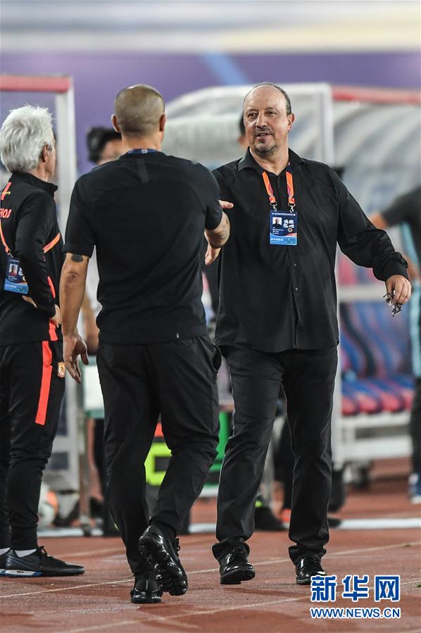 8月25日,大连人队主教练贝尼特斯(右)与广州恒大淘宝队主教练卡纳瓦罗赛后握手。 当日,在2020赛季中国足球协会超级联赛第一阶段(大连赛区)第七轮比赛中,广州恒大淘宝队以2比2战平大连人队。 新华社记者潘昱龙摄