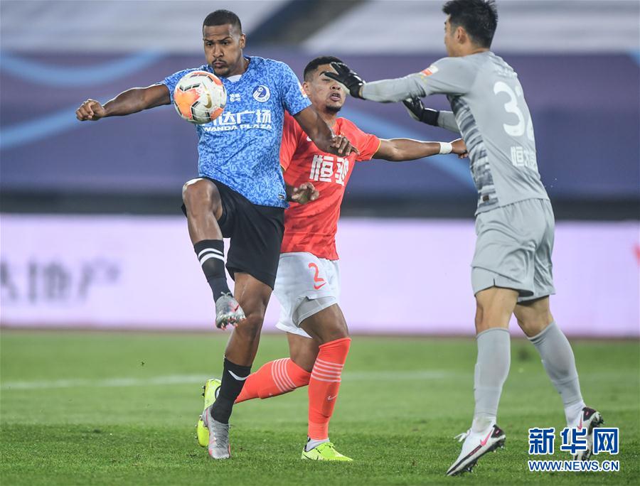 8月25日,大连人队球员龙东(左)在比赛中射门。 当日,在2020赛季中国足球协会超级联赛第一阶段(大连赛区)第七轮比赛中,广州恒大淘宝队以2比2战平大连人队。 新华社记者潘昱龙摄
