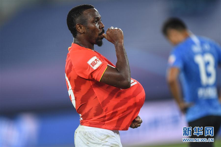 8月25日,广州恒大淘宝队球员费南多进球后庆祝。 当日,在2020赛季中国足球协会超级联赛第一阶段(大连赛区)第七轮比赛中,广州恒大淘宝队以2比2战平大连人队。 新华社记者潘昱龙摄