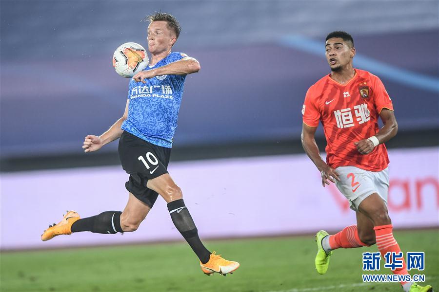8月25日,大连人队球员拉尔森(左)在比赛中停球。 当日,在2020赛季中国足球协会超级联赛第一阶段(大连赛区)第七轮比赛中,广州恒大淘宝队以2比2战平大连人队。 新华社记者潘昱龙摄