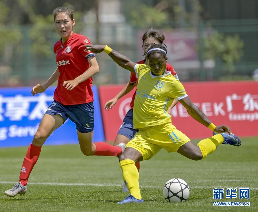 8月26日,江苏苏宁女足球员塔比莎(右)在比赛中射门。 当日,在2020年中国足球协会女子足球超级联赛第2轮比赛中,江苏苏宁女足以5比0战胜河南建业女足。 新华社记者江文耀摄