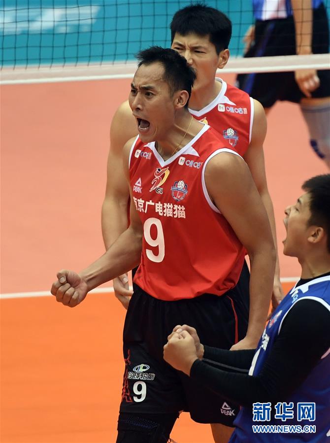 8月26日,江苏南京广电猫猫队球员刘向东(中)在比赛中庆祝得分。 当日,在河北秦皇岛进行的2019-2020赛季中国男子排球超级联赛第二阶段E组比赛中,江苏南京广电猫猫队以3比2战胜河南队。 新华社记者 朱旭东 摄