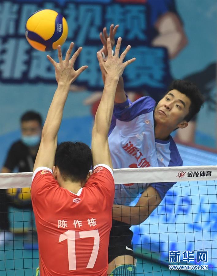 8月26日,浙江体彩队球员张景胤(右)在比赛中扣球。 当日,在河北秦皇岛进行的2019-2020赛季中国男子排球超级联赛第二阶段F组比赛中,浙江体彩队以3比0战胜福建师范大学队。 新华社记者 朱旭东 摄
