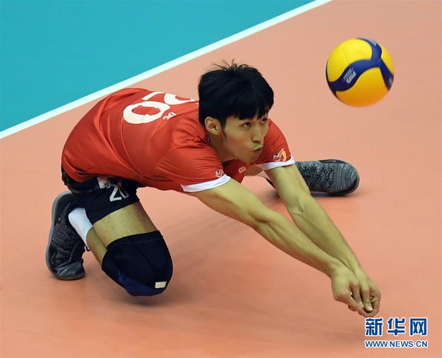 8月26日,福建师范大学队球员程虎在比赛中垫球。 当日,在河北秦皇岛进行的2019-2020赛季中国男子排球超级联赛第二阶段F组比赛中,福建师范大学队以0比3不敌浙江体彩队。 新华社记者 朱旭东 摄