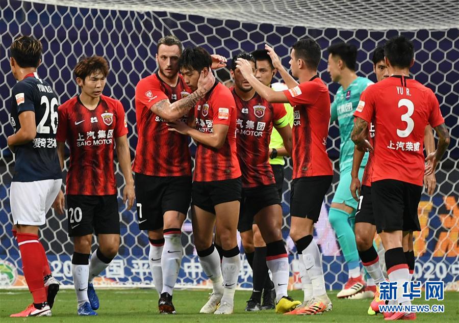 8月26日,上海上港队球员阿瑙托维奇(左三)进球后与队友庆祝。 当日,在2020赛季中国足球协会超级联赛第一阶段(苏州赛区)第七轮比赛中,上海上港队以3比0战胜重庆当代队。 新华社记者韩瑜庆摄