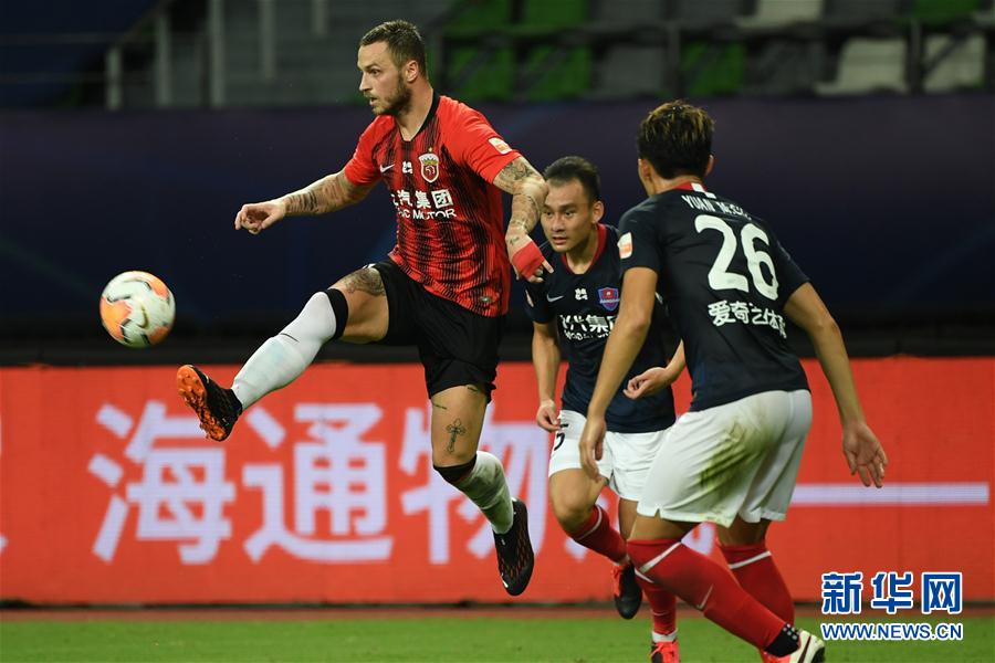 8月26日,上海上港队球员阿瑙托维奇(左)在比赛中控球。 当日,在2020赛季中国足球协会超级联赛第一阶段(苏州赛区)第七轮比赛中,上海上港队以3比0战胜重庆当代队。 新华社记者韩瑜庆摄