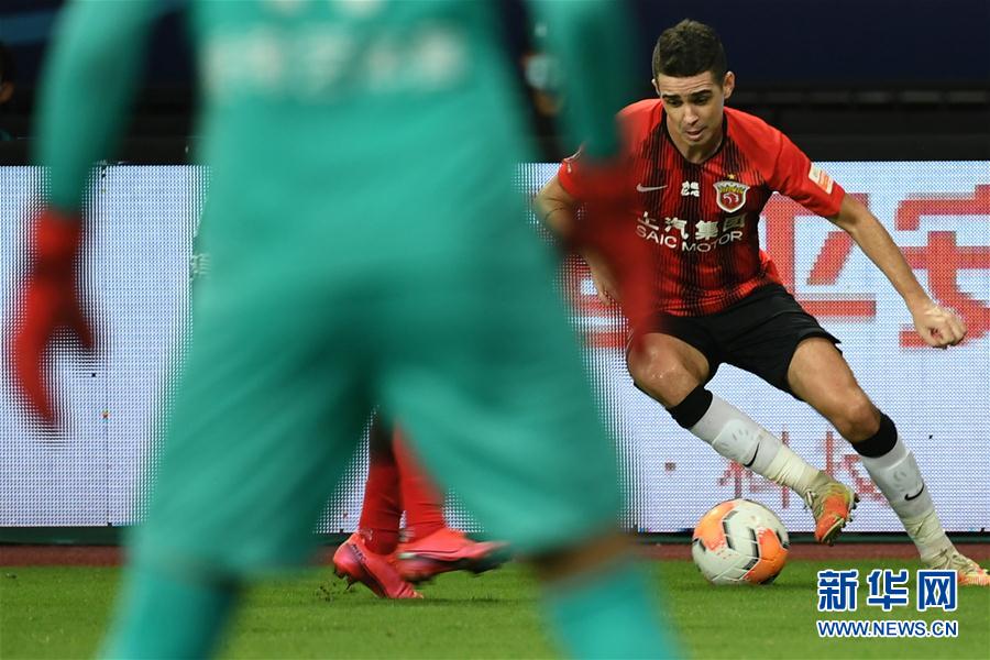8月26日,上海上港队球员奥斯卡(右)在比赛中突破。 当日,在2020赛季中国足球协会超级联赛第一阶段(苏州赛区)第七轮比赛中,上海上港队以3比0战胜重庆当代队。 新华社记者韩瑜庆摄