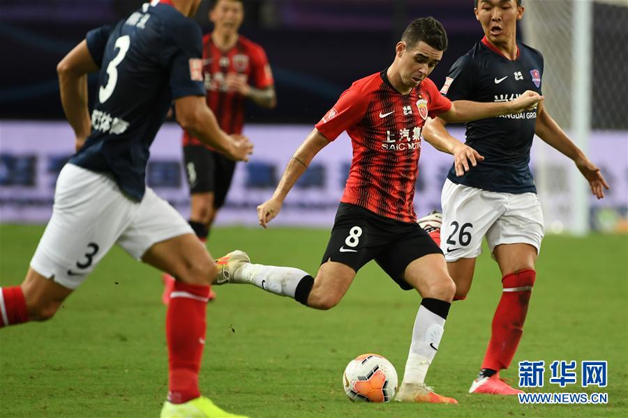 8月26日,上海上港队球员奥斯卡(右二)在比赛中射门。 当日,在2020赛季中国足球协会超级联赛第一阶段(苏州赛区)第七轮比赛中,上海上港队以3比0战胜重庆当代队。 新华社记者韩瑜庆摄
