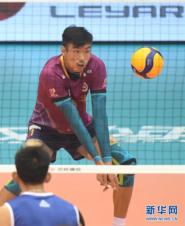 8月27日,上海金色年华队球员戴卿尧(上)在比赛中垫球。 当日,在河北秦皇岛进行的2019-2020赛季中国男子排球超级联赛第二阶段E组比赛中,上海金色年华队以0比3不敌江苏南京广电猫猫队。 新华社记者朱旭东摄