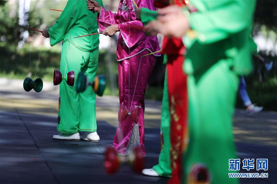 8月11日,几位老人在北京五棵松空竹文化广场抖空竹。新华社记者 王东震 摄
