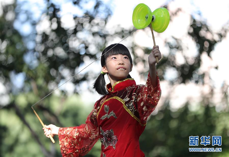 8月11日,董雨桐在北京五棵松空竹文化广场抖空竹。新华社记者 王东震 摄