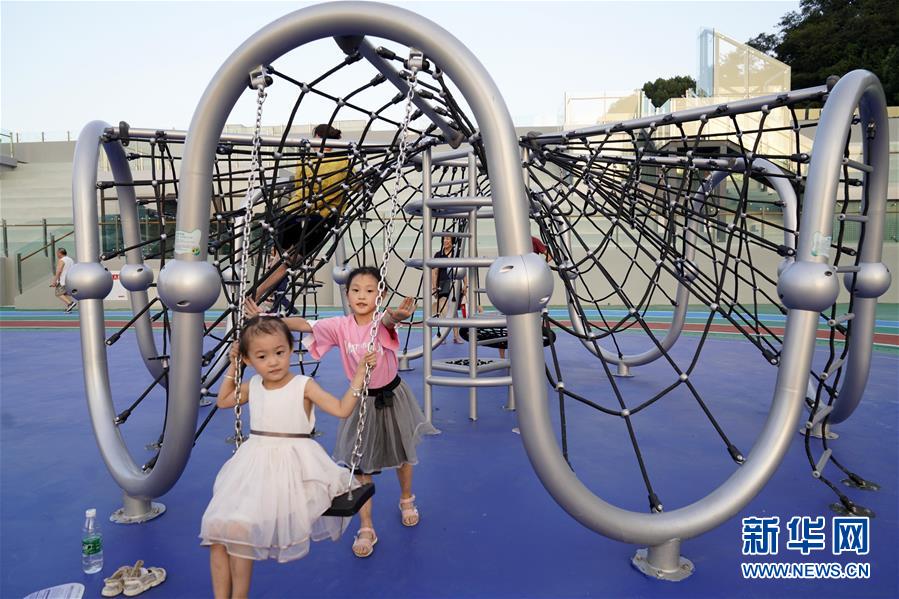 8月26日,小朋友在重庆市北碚区正码头广场的体育运动公园内游玩。 当日,位于重庆市北碚区正码头广场的体育运动公园建成对外开放。公园的前身是北碚体育场,因建设年代较早,存在场馆陈旧、项目单一、设施老化等问题。 改建后的北碚体育运动公园占地面积约20亩,包括运动场地以及梧桐树文艺表演区、宝贝文艺音乐区、乐活运动场区、儿童游乐区等。 新华社发(秦廷富 摄)