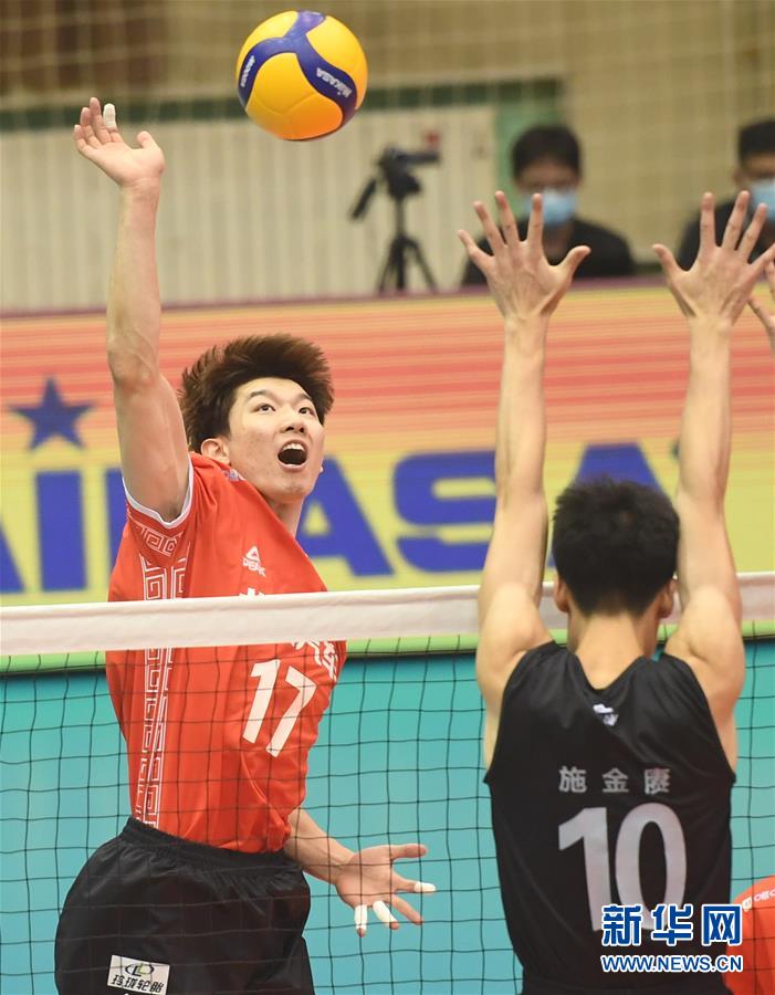 8月28日,北京汽车队球员刘力宾(左)在比赛中扣球。 当日,在河北秦皇岛进行的2019-2020赛季中国男子排球超级联赛第二阶段F组比赛中,北京汽车队以3比0战胜福建师范大学队。新华社记者 朱旭东 摄