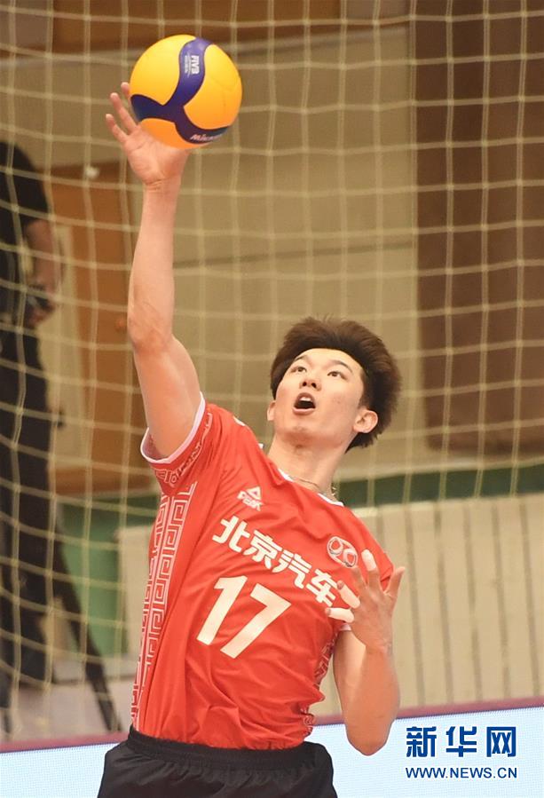 8月28日,北京汽车队球员刘力宾在比赛中发球。 当日,在河北秦皇岛进行的2019-2020赛季中国男子排球超级联赛第二阶段F组比赛中,北京汽车队以3比0战胜福建师范大学队。 新华社记者 朱旭东 摄