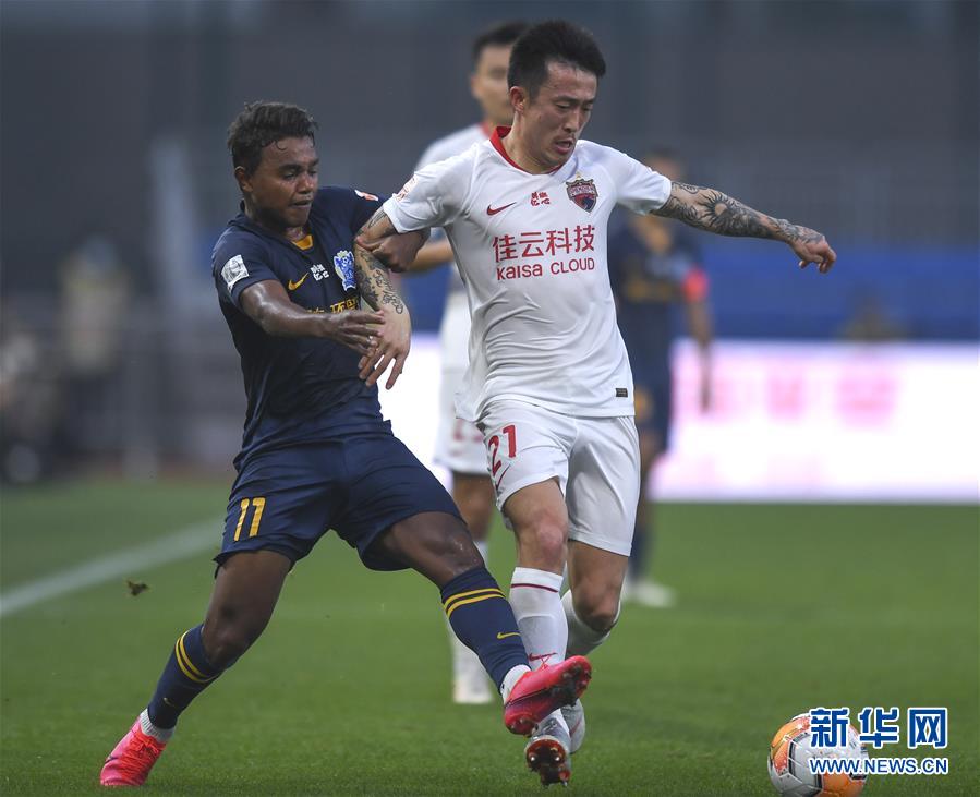 8月29日,广州富力队球员雷纳迪尼奥(左)在比赛中与深圳佳兆业队球员姜至鹏拼抢。 当日,在2020赛季中国足球协会超级联赛第一阶段(大连赛区)第八轮比赛中,广州富力队对阵深圳佳兆业队。 新华社记者龙雷摄