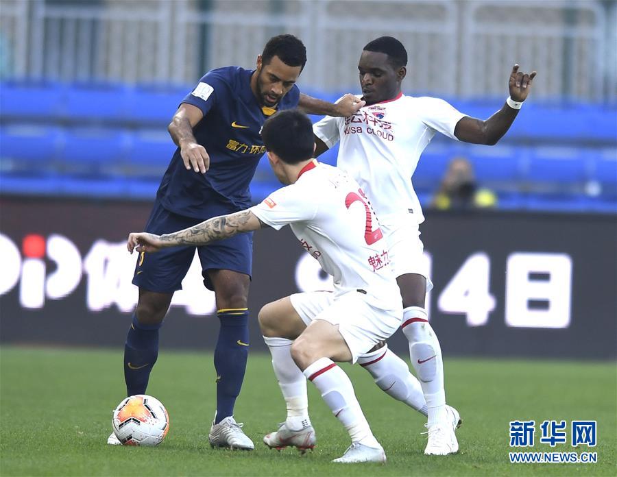 8月29日,广州富力队球员登贝莱(左)在比赛中与深圳佳兆业队球员比福马(右)、姜志鹏拼抢。 当日,在2020赛季中国足球协会超级联赛第一阶段(大连赛区)第八轮比赛中,广州富力队对阵深圳佳兆业队。 新华社记者龙雷摄