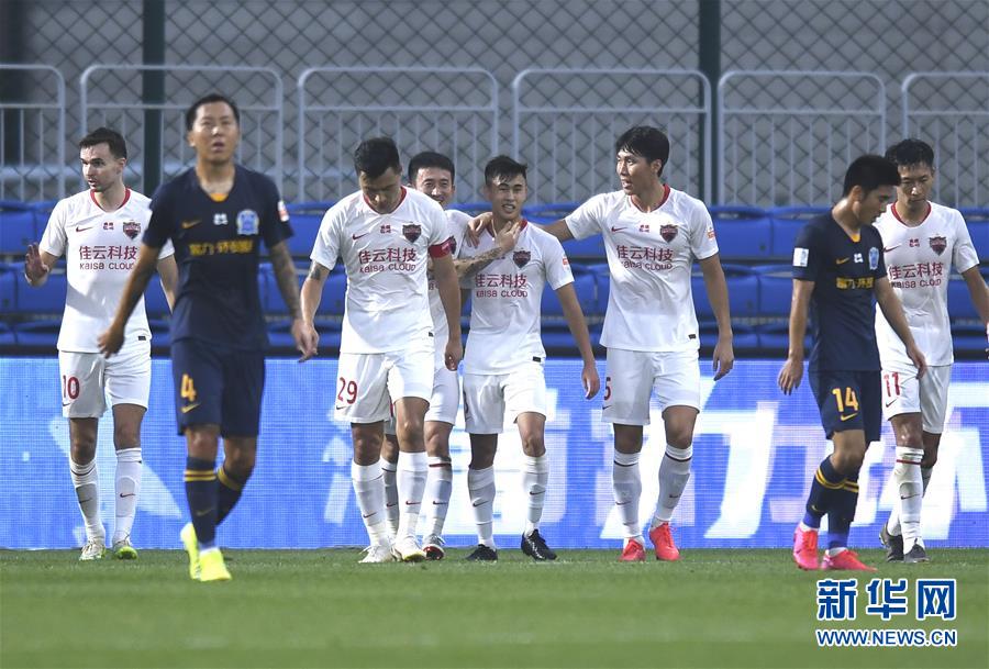 8月29日,深圳佳兆业队球员戴伟浚(右四)在进球后与队友庆祝。 当日,在2020赛季中国足球协会超级联赛第一阶段(大连赛区)第八轮比赛中,广州富力队对阵深圳佳兆业队。 新华社记者龙雷摄