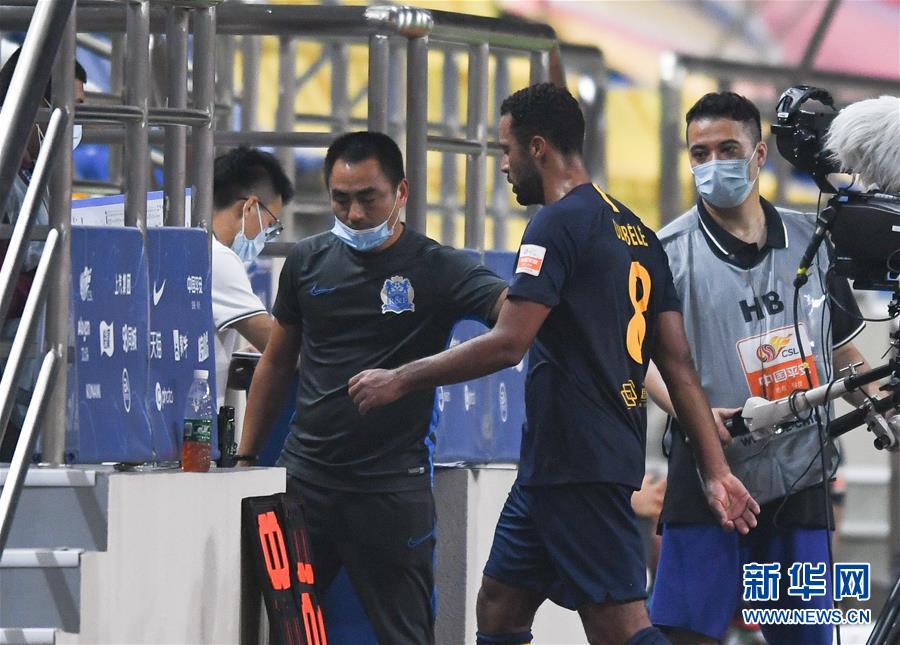 8月29日,广州富力队球员登贝莱(右二)被红牌罚下后离场。 当日,在2020赛季中国足球协会超级联赛第一阶段(大连赛区)第八轮比赛中,深圳佳兆业队以2比0战胜广州富力队。 新华社记者 龙雷 摄